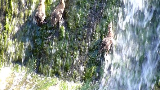 Утята лезут на стену и падают вниз. Нырки плавают под водой