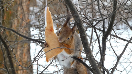 Белочка нашла себе вкусную игрушку - кусочек сала.