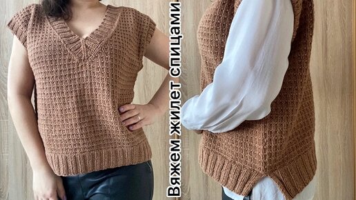 Мастер класс жилет спицами простым узором с V-образным вырезом и разрезами по бокам!