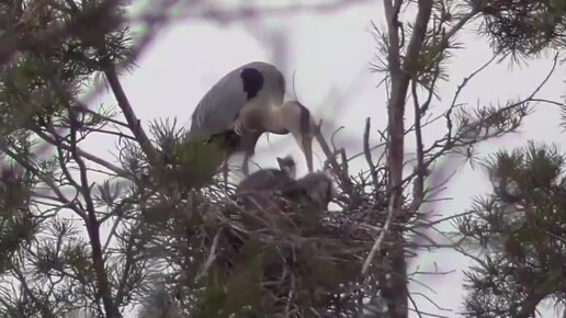 Серые цапли в начале лета. Гнездо и птенцы высоко на сосне