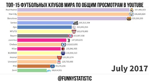 Топ-15 футбольных клубов мира по количеству просмотров официальных Ютуб-каналов