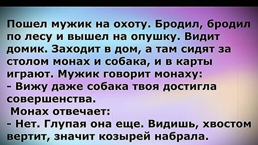 Пошел мужик на охоту. Бродил, бродил по лесу и вышел на опушку. Видит домик. Заходит в дом, а там сидят за столом монах и...