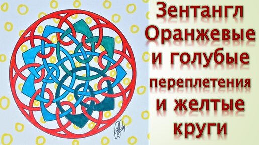 Зентангл Оранжевые и голубые переплетения и желтые круги