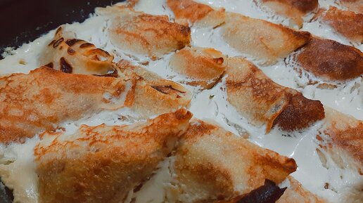 Запеченные блинчики с мясом, в сметанно - сливочном соусе.