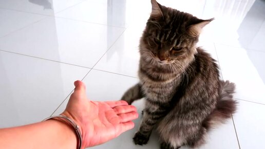 Учу нашу кошку МЕЙН КУНА Герду команде ДАЙ ЛАПУ и ЛЕЖАТЬ Дрессировка.mp4