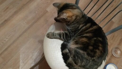 Кошка, с улицы не отходит от нового хозяина, благодарит.
