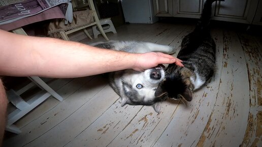 За руками следи - кот Феликс охраняет свою леди хаски Айсан