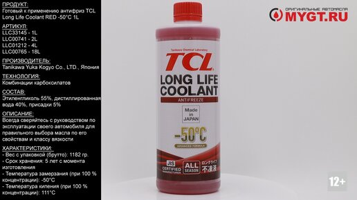 Готовый к применению антифриз TCL Long Life Coolant RED -50°C 1L LLC33145 #ANTON_MYGT