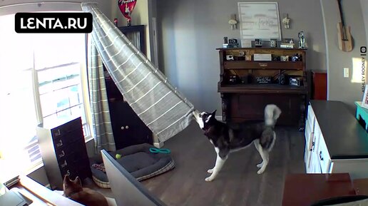 Собака попыталась сорвать шторы, но её остановил крик хозяйки из камеры видеонаблюдения