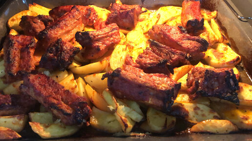 Жаренные свиные ребра с картофелем в медово-томатном соусе. Отличный ужин для всей семьи!