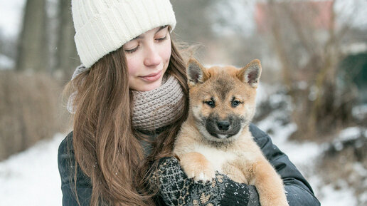 Щенки Сиба-Ину играют на первом снегУ с мамой