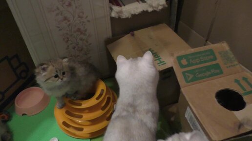 Смотрим как коты и котята реагируют на игушку с колокольчиком.