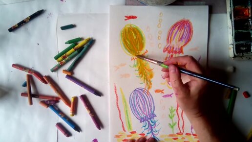 Объясняю, как нарисовать море и медуз восковыми мелками и акварелью для детей.