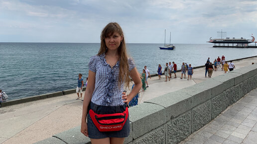 Набережная Ялты днем | Красивые хвойные деревья, много людей