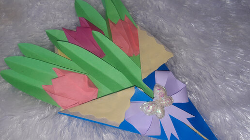 8 марта. Тюльпаны. Открытка. Подарок. Сюрприз. Для мамы. Своими руками. Из бумаги. Цветы. Букет. Букет цветов. Красивая открытка