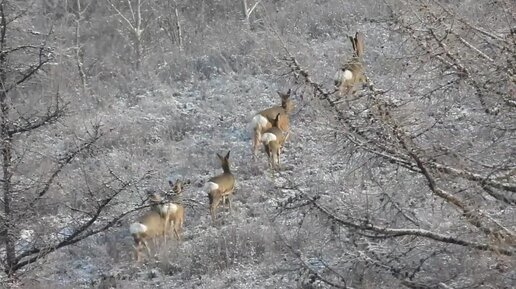 Стадо косуль резво продвигается вверх по склону