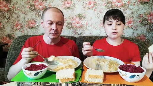 МУКБАНГ. Вкуснейшая картошка с тушёнкой, салат свекла.