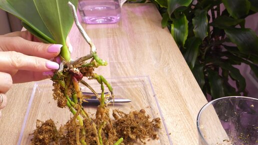 Наращиваю корни орхидее в новой посадке. Обязательно отсекаю часть ствола.
