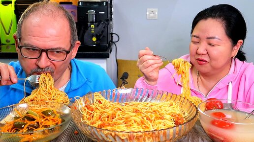 Мукбанг БОЛОНЬЕЗЕ с ПОМИДОРАМИ В СНЕГУ и ОГУРЦАМИ ПО КОРЕЙСКИ НА ЗИМУ