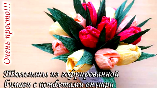 Букет с сюрпризом! Тюльпаны из гофрированной бумаги своими руками с конфетками внутри. Как сделать цветы из бумаги.