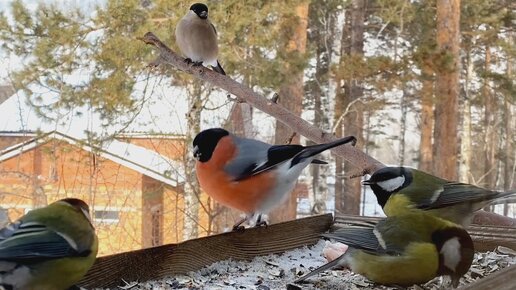 Синицы дают жесткий отпор наглым снегирям. Птичий мугбанг продолжается.