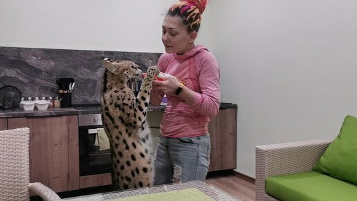 Голодный сервал отжимает курицу
