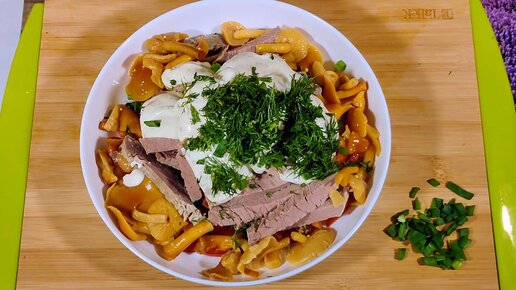 Салат с отварной говядиной. Заправка решает всё! Понравился даже детям.