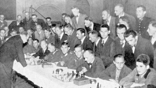 Александр Алехин побил Юджина Саломона в испанском Хихоне, разыграв дебют слона в партии сеанса на 10 досках, 1944 год