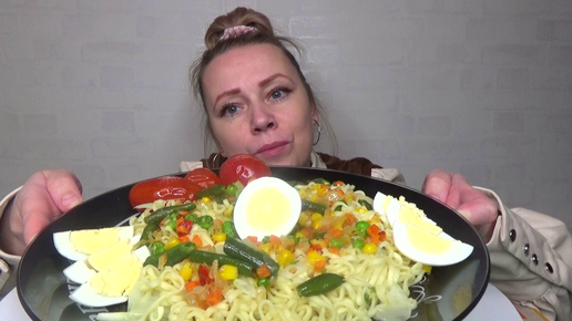 Мукбанг лапша быстрого приготовления Биг Ланч с овощами, соленья домашние. Еда на камеру.
