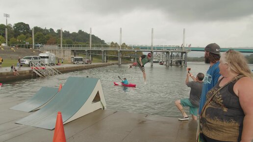 Прыжки с трамплина в реку на роликах, скейтборде и велосипеде.