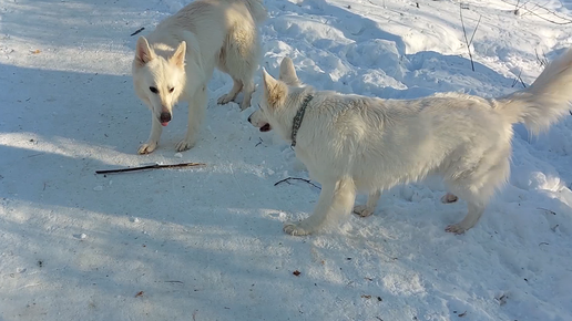Утренняя прогулка двух белых швейцарских овчарок