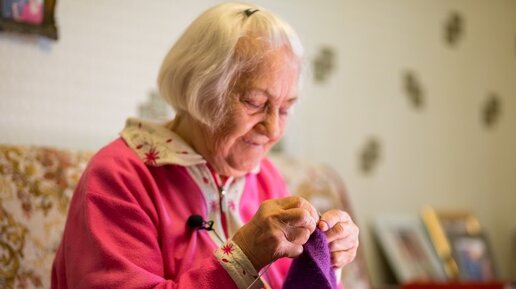 Бабушка вяжет шерстяные вещи для младенцев-сироток