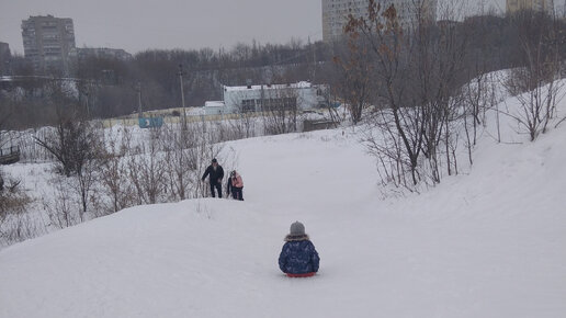 Зимние забавы для детей в конце зимы. Со снежной горы вниз на ледянке или санках.