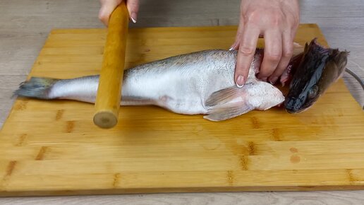 Скалкой бью судака по бокам, готовлю его по маминому фирменному рецепту.
