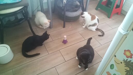 Котосемья. Получили в подарок новую игрушку.
