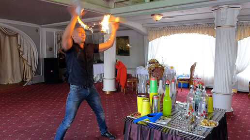 Бармен, профессионально жонглирую бутылками, делает коктель для молодоженов!