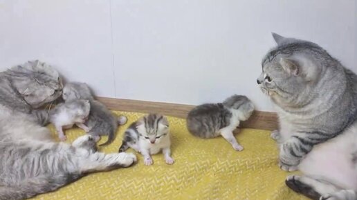 Супер заботливый папа кот целует маму кошку и своих мяукающих котят