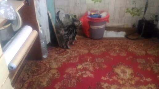 Киса чешит ухо и заберает еду
