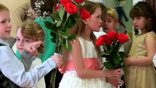 Дети на выпускном утреннике дарят цветы воспитателям и другим работникам Детского Сада