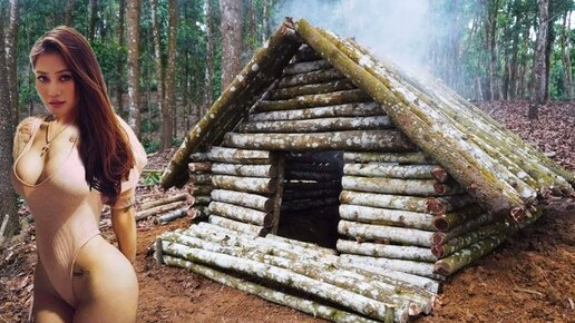 Девушка построила самый красивый шалаш из бамбука.- Сделать простое убежище.- В одиночестве в лесу