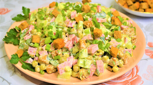 Простой в приготовлении салат с копченой колбасой и сухариками!