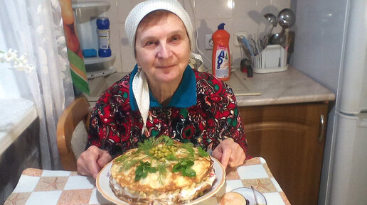 Блинный торт с крабовым мясом и рыбой. Закусочный торт.