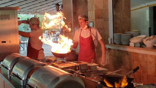 Показываю весь процесс приготовления поваром вок лапши с огнем на отдыхе в Турции в отеле Sea World Resort & Spa