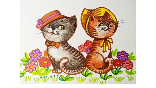 Кот и кошечка - рисунок фломастерами и цветными карандашами.