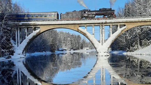 Паровоз с «Рускеальским экспрессом» на мосту через Янисйоки в Карелии