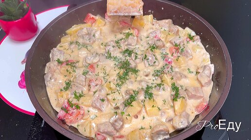 Мой фирменный рецепт жаркого из свинины с грибами в сливочно-сметанном соусе.(полный состав продуктов в описании к видео)