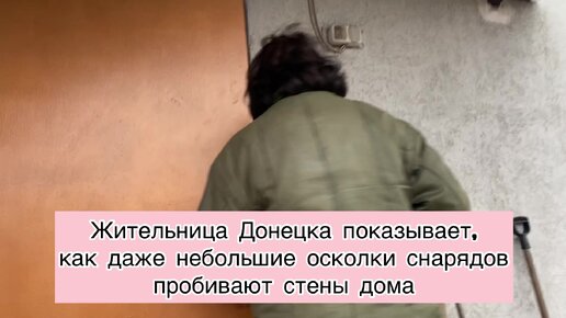 Жительница Донецка показывает, как даже небольшие осколки снарядов пробивают стены домов