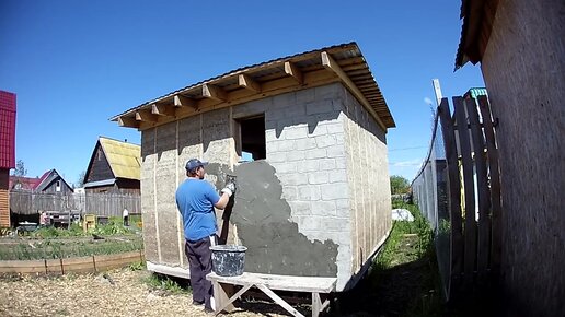 Штукатурю тёплый сарай из арболита. Имитация каменной кладки .