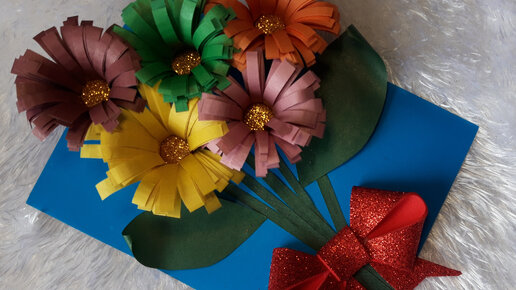 8 марта. С днем рождения. Открытка. Подарок. Своими руками. Из бумаги. Из картона. Цветы. Букет. Хризантемы. Цветочки. Красивая.