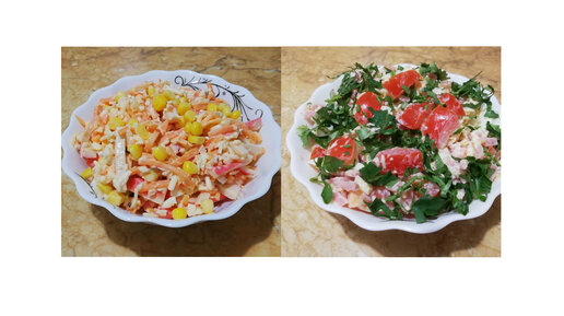 Два необычных салата на праздник: с ветчиной, с крабовыми палочками.